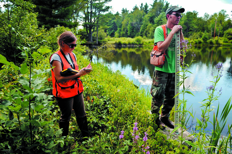 Shannon Chapin, left, records notes from surveying a dam Wednesday with Steve Knapp at an impoundment on Vaughan Stream in Hallowell. The Kleinschmidt Associates employees are locating and assessing dams across Maine for the National Marine Fisheries Service to locate barriers to fish passage for native species, according to a statement from the federal agency. The inventory on approximately 394 dams in the state performed by the crew consists of locating a structure across a waterway, assessing the condition and determining the current use.