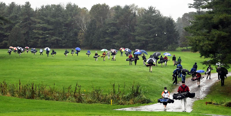 High School golfers walk across the greens Tuesday before the Kennebec Valley Athletic Conference tournament held at Natanis Golf Course in Vassalboro. The students teed off in pouring rain to determine which teams and individuals qualified for the state tournament. Some sun and cooler temperatures are forecast for the remainder of the week.