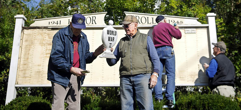 Arthur Moore, left, hands Ernie McPherson a crest from Hallowell’s World War II memorial Thursday as Bert Truman, second from right, and Mike Madden remove the 394 names displayed in the case listing Hallowell residents who served in World War II. The Hallowell American Legion post members were breaking down the memorial, erected 20 years ago on the lawn of the post office, to collect the names for the new memorial scheduled to be unveiled in May at the Hallowell Cemetery. The veterans said they hope to raise about $30,000 to defray costs for the granite marker. Moore served in the merchant marine and McPherson served with the Marines in World War II.