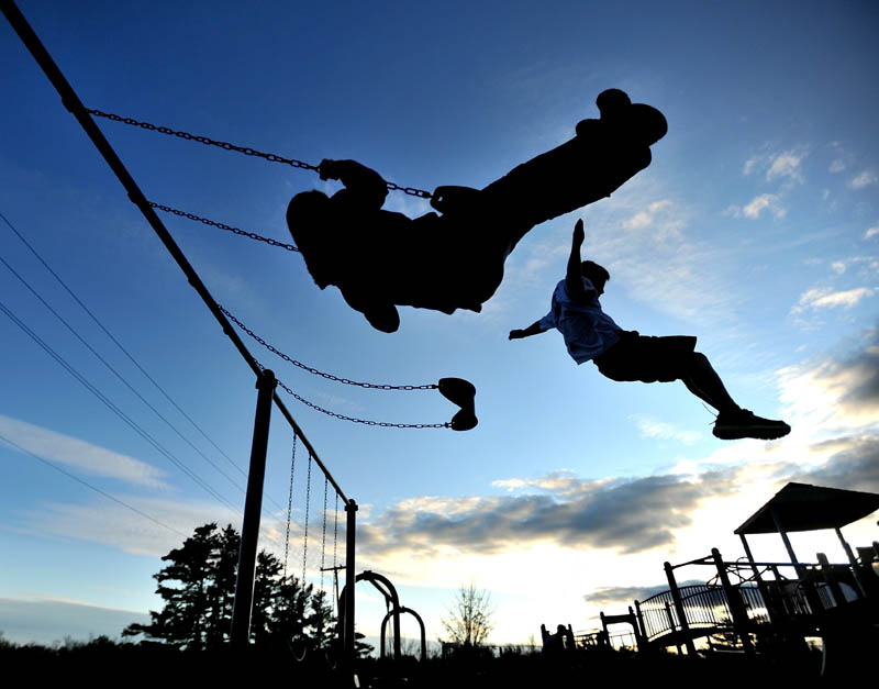 Briana Quirion, 12, center, swings as her brother Alex Owens, 10, leaps from his swing Tuesday at North Street Park in Waterville.