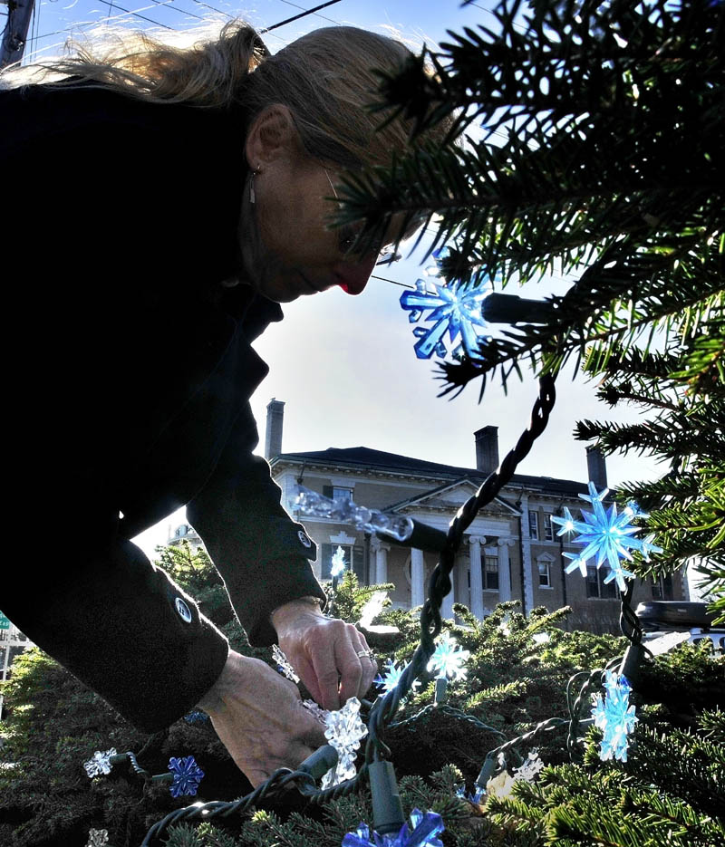 Karen Zeleniak zip ties a string of lights onto a bush Tuesday in Augusta. The blue and white snowflakes are just some of the thousands of lights that she and her husband Dr. Darryl Zeleniak strung up in front of his office at the corner of State and Green Streets across from the Gov. Hill Mansion. The display is synchronized to holiday songs and will start Friday. “We’re trying to turn ‘Black Friday’ into White Friday,” said Dr. Zeleniak.