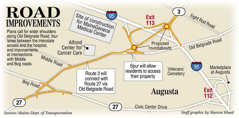 Plans call for wider shoulders along Old Belgrade Road, four lanes between the interstate access and the hospital, and improvements at intersections with Middle and Bog roads.
