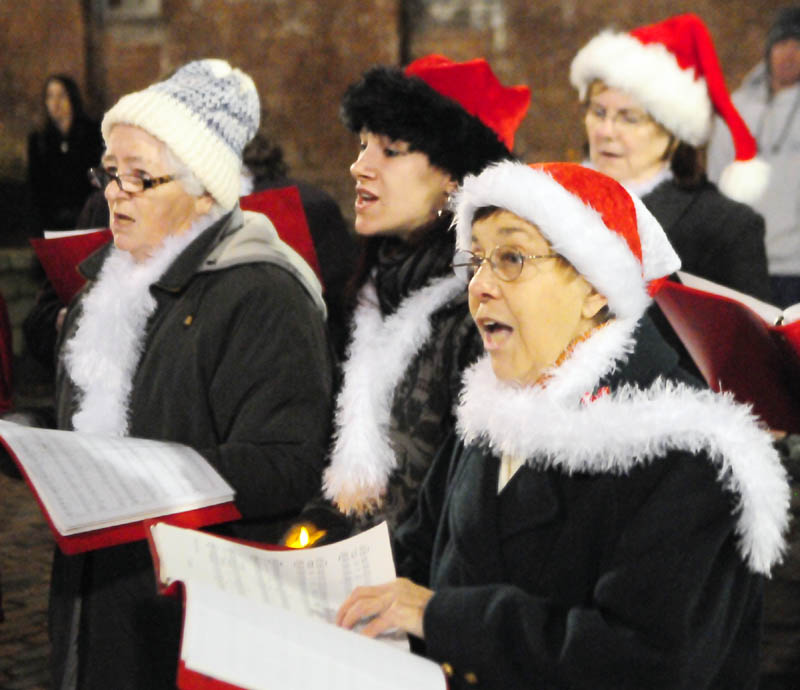 Members of Maine-Ly Harmony sing Christmas carols Thursday evening in the Johnson Hall Mini-Park in Gardiner. They were the opening act for Santa Claus, who arrived for the tree lighting at 6:30. Tonight from 5:30 to 9 :30 there will be a art walk in downtown Gardiner. Santa will be back on Water Street on Saturday, and there will be a parade at 11:30 a.m.