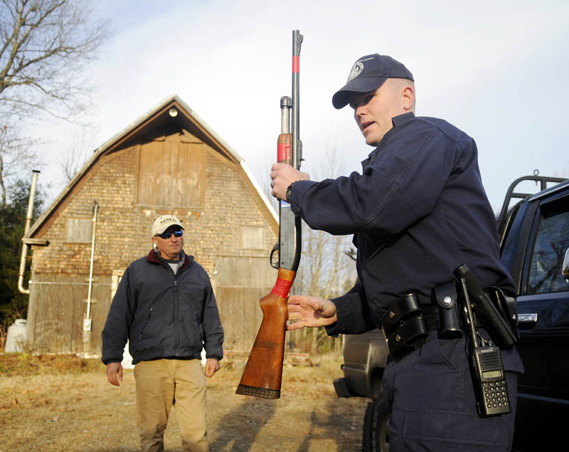 Maine State Police cadet Niles Krech, right, seizes a shotgun Monday from a pickup operated by David Webber during a class conducted at the Maine Criminal Justice Academy in Vassalboro. Law enforcement students enrolled at the Academy are participating in live training scenarios around the campus this week with police officers from agencies across Maine. The cadets are scheduled to investigate sequences including car accidents, burglaries and a report of shots fired. Webber, a York Police Department reserve officer, played the role of an agitated hunter caught with an illegal deer.