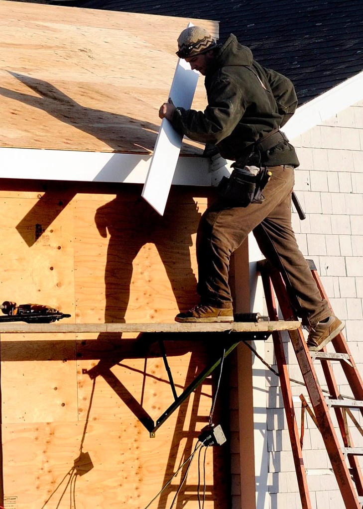 Jesse Hamilton carries up another piece of trim board to at a construction site this week in Augusta. Hamilton, who runs Hamilton Custom Builders, said that the warm weather was making it easier to build the family room addition.