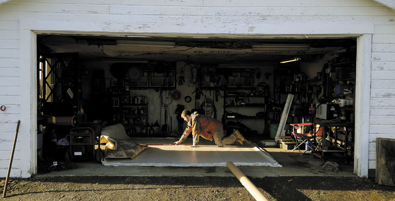 Aaron Bonenfant slices a piece of vinyl flooring Thursday in a customer’s garage in Sidney. The owner of Bonenfant Builders, of Farmingdale, said that he is fortunate to still be able to work comfortably outside while repairing the interior of homes. “This is great weather,” he remarked.