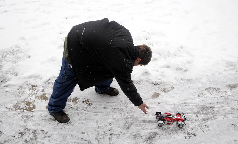 Ricky Trask, 12, launches an electric car Sunday on a fresh coat of snow at his Gardiner home. Trask said he received the remote controlled vehicle as a gift on Christmas eve and wanted to try operating it on snow.