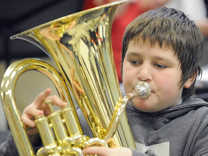 Robbie Cooper plays the baritone horn Tuesday as the Cony Middle School Band rehearses for its upcoming Caribbean Festival Concert, which raises money for a spring trip to Washington, D.C. The Caribbean Festival is at 6:30 p.m. Wednesday, Jan. 25, at Cony High School. Tickets are $8 apiece.