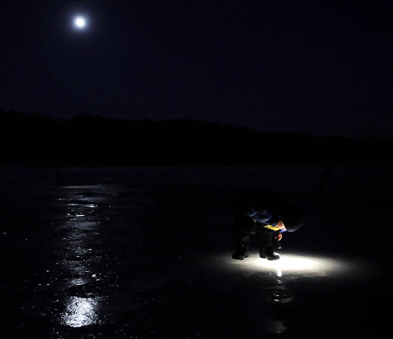 Lucas Andrews, 3, peeks beneath the shelf of ice holding him on the Kennebec River in Hallowell on Monday evening. Andrews searched for fish while his brother, Isaac, and father, Steve, skated beneath a nearly full moon.