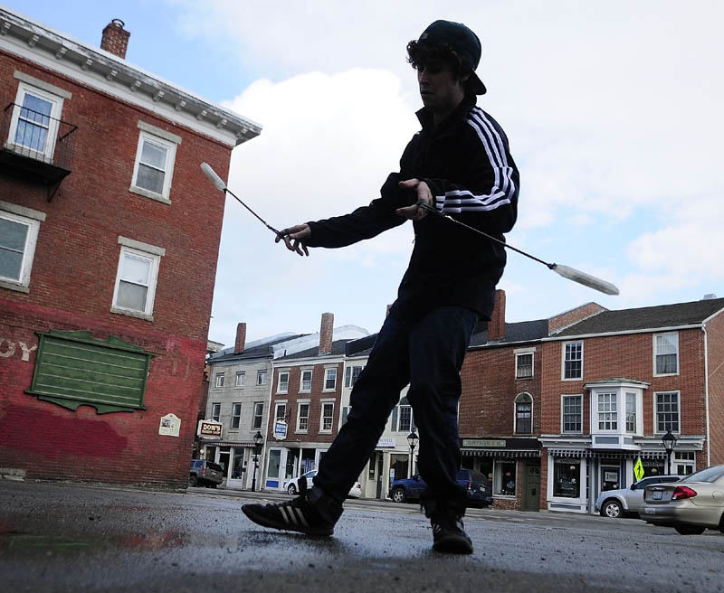 Richard Baird practices swinging poi Wednesday afternoon near the intersection of Union and Water streets in Hallowell. A performance art, poi involves swinging tethered weights through a variety of rhythmical and geometric patterns.