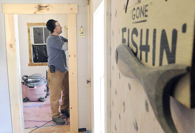 John Rice does renovation work at Castle Island Camps on Tuesday afternoon in Belgrade. There are 12 waterfront cabins for rent from late April to mid-September in the complex on Castle Island Road.