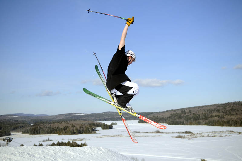Ben Fulmer, of Readfield, hits a bump Tuesday beneath blue skies while free style skiing on the slope overlooking Torsey Pond at Kents Hill School in Readfield. The private prep school competes in downhill, snowboarding and free style skiing.