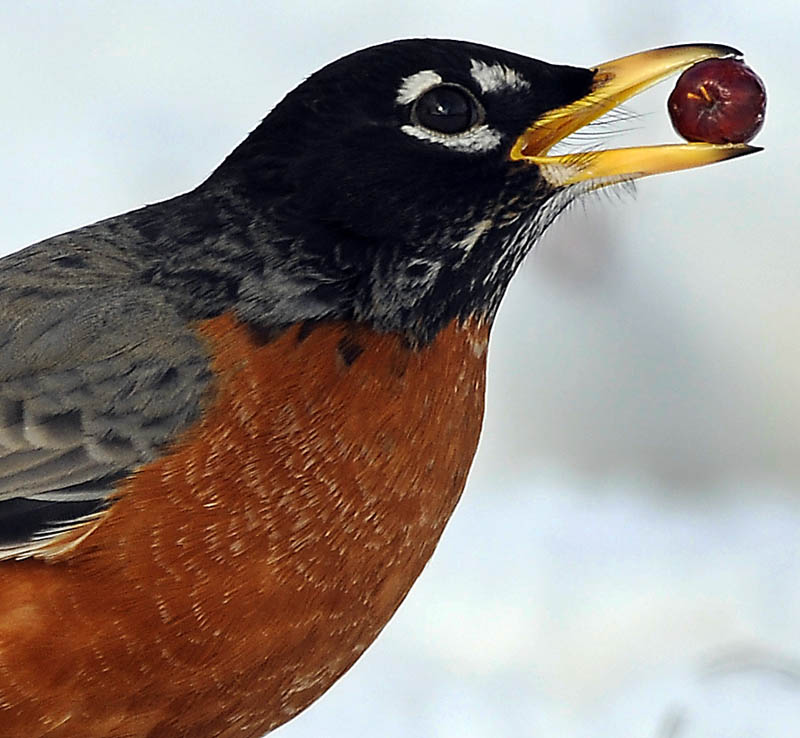 An American Robin collects a berry Sunday morning beneath a fruit tree in Augusta. Flocks of the thrushes that reside across North America are often detected in the late winter stripping fruit from limbs.