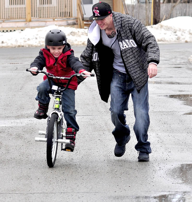 Gabe Sprague learns to ride his new bicycle that he got on his ninth birthday on Sunday as his stepfather Paul Gombos lends a hand along May Street in Waterville.