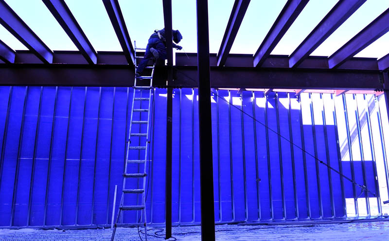 Josh Laury welds steel girders in the section where dressing rooms for cast members are being built during renovations for the Waterville Opera House on Monday.