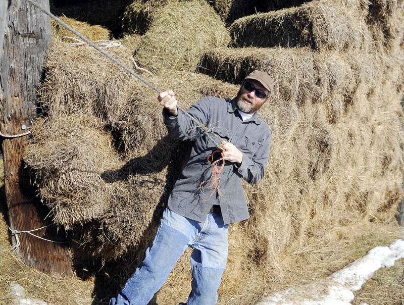 Harry Dwyer of Fayette secures a load of hay that he collected at Maine Lee Morgan Horse Farm in Manchester on Wednesday. Dwyer, a forester and logger, was picking up feed for his mustangs while waiting for the woods to dry.