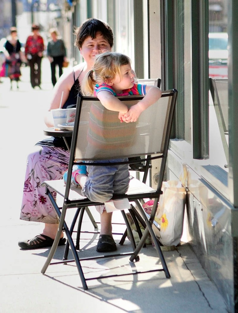 Azalea Voorhees looks through the window at people inside The Downtown Diner on a warm Tuesday afternoon. She and her mother, Annie Voorhees, had their lunch outside on the first day of spring. The diner had just set up sidewalk seating Monday for the season. It should be warm today and Thursday before a cold spell arrives Friday.