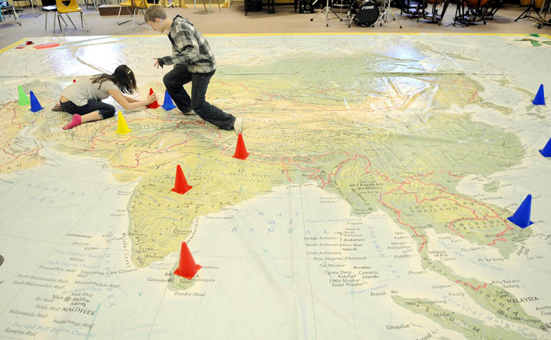 Maranacook Community High School freshmen Taylor Kubicki, left, and Austin Harris race Tuesday to place a cone atop Syria within a map loaned to the school by the National Geographic Society. The room-sized map, with meticulous geographic and political detail, was borrowed by teacher Carrie Emmerson for a week to teach elementary school students geography and instruct the freshman global exploration class.