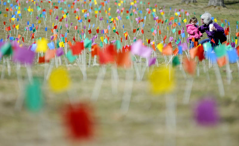 Robin Chapman holds her granddaughter, 2-year-old Emilee Chapman, on Monday in the field of flags arranged by the Maine Autism Alliance at Capitol Park in Augusta. The display served to remind Mainers of the approximately 2,800 children in the state diagnosed with Autism on World Autism Day. The Albion pair visited the display to show support for Emileeās brother, Landon, 3, who is diagnosed with Autism.