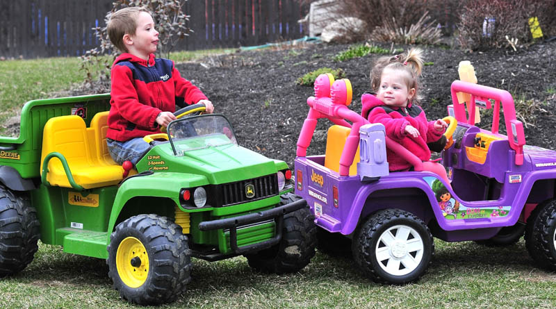 Madison Hart looks back at her cousin Hunter Hart-Guertin, who tried to pass her. The two drove battery-powered cars during a birthday party in Waterville recently.