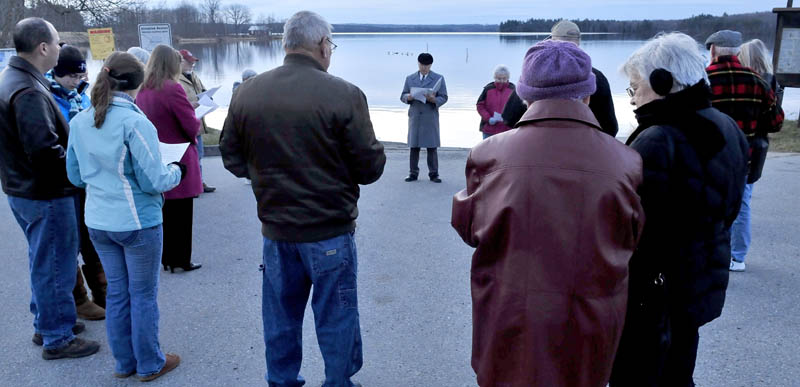 Pastor Gary Hubley, center, of the Vassalboro United Methodist Church, leads an Easter sunrise service Sunday on the banks of China Lake in East Vassalboro. Though the sun did not break through the clouds, 24 parishioners and a flock of seagulls in the background gathered for the service.