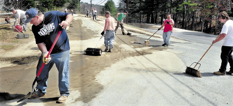 More than a dozen local men armed with brooms and shovels cleaned winter sand and gravel off Donigan Road in Moscow on Tuesday. Road Commissioner Jay Rollins said there is enough road work to keep the workers busy for a week.