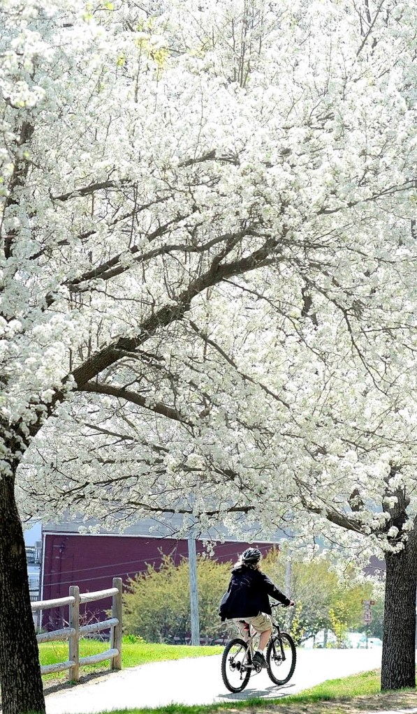 A cyclist passes under flowering ornamental trees on the Kennebec River Rail Trail while heading into downtown Hallowell on a warm, sunny Sunday afternoon.