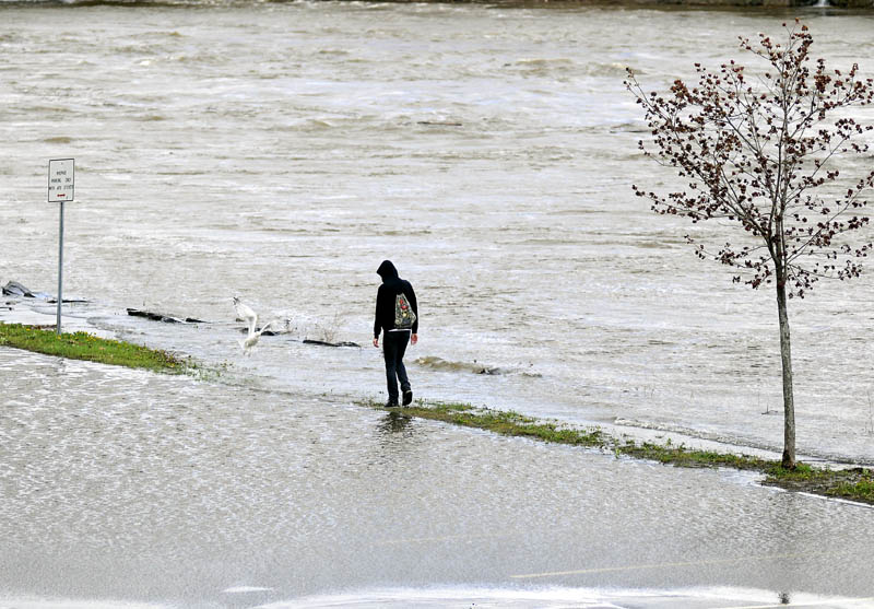 A man walks down the flooded sidewalk between the Kennebec River and parking lots off Water Street in Augusta on Tuesday. The river rose over its banks in the late afternoon and a flood advisory is expected to remain in effect today with more rain in the forecast.