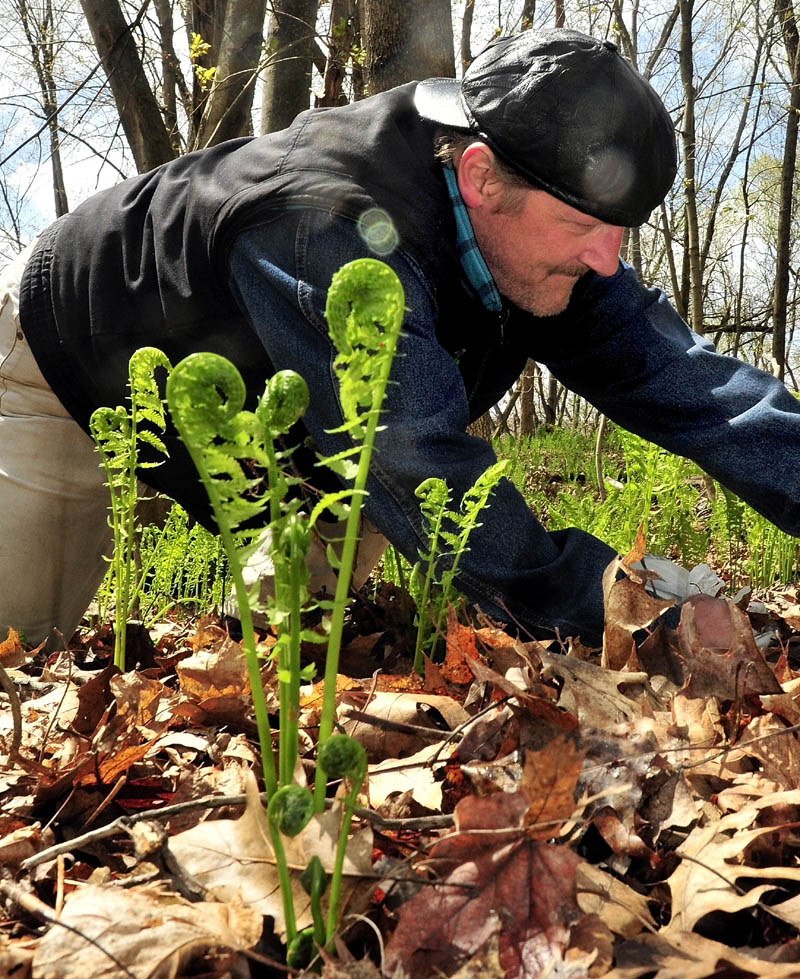 James "Buddy" Dunn searches for fiddlehead ferns that have not opened and gone by along the Kennebec River in Waterville on Tuesday. Dunn said the picking has been good and he picked 20 pounds recently.