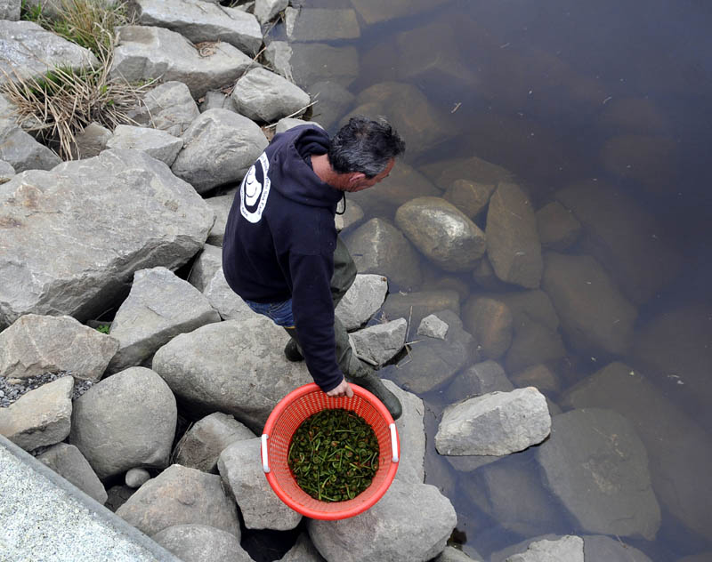 Clayton Smith, of Harpswell, carries a basket of fiddleheads he harvested in Hallowell down to the Kennebec River to wash. “The season has just started,” Smith said of the ferns that grow in river valleys, but he has already picked about 600 pounds.