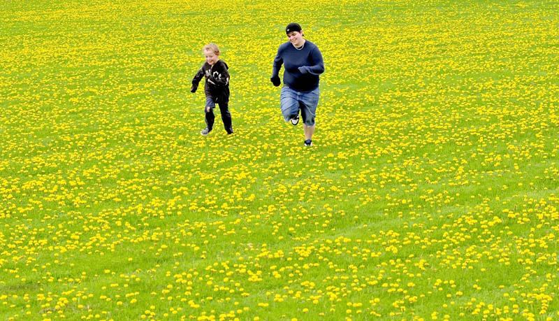 T.J. Perkins and his sister Valerie race through a field of dandelion flowers at the Field of Dreams park in Unity on Saturday.