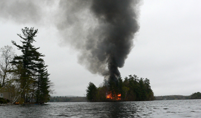 The home on Coon Island in Togus Pond that Rob Deschamps owned with his wife, Allison Ames, was destroyed Friday by a fire that investigators say was deliberately set.
