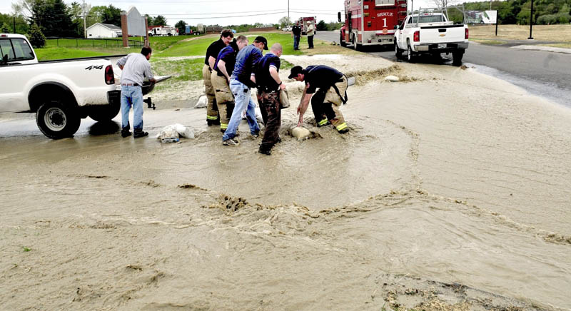 Waterville firefighters and Thomas College personnel scramble to place sandbags to divert rushing water from a water main break at the Waterville campus on Monday. Water gushed up through the ground along the new entrance road and drained toward the Student Center, and toward the main campus parking lots.