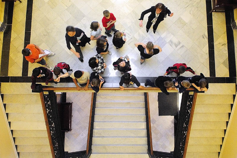 About seven hours after the Legislature adjourned around 3 a.m. Thursday, Rep. Susan Morissette, R-Winslow, top right, leads a tour of the State House in Augusta for a fifth-grade class from Winslow Elementary.