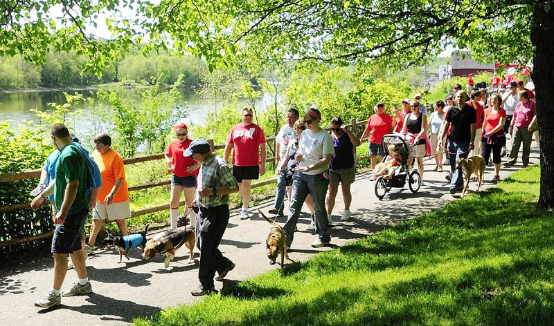 Participants in the AIDS Walk of Central Maine start north from Hallowell on Saturday morning. About 100 people took part in the fundraiser for MaineGeneral Medical Center’s Horizon Program. They walked a five kilometer route from Hallowell to downtown Augusta on Kennebec River Rail Trail and 10 kilometer runners did that twice.
