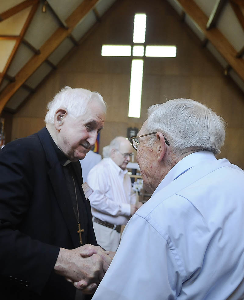 Rev. Walter Brown, left, greets Randolph United Methodist Church parishioner Dick Leighton during a 50th anniversary celebration of the chapel’s construction Sunday. The church was razed by fire and rebuilt in 1961. Brown served between 1965 and 1971 at the church where Leighton has been a member for more than 50 years. Randolph United Methodist Church has been holding services for 165 years.