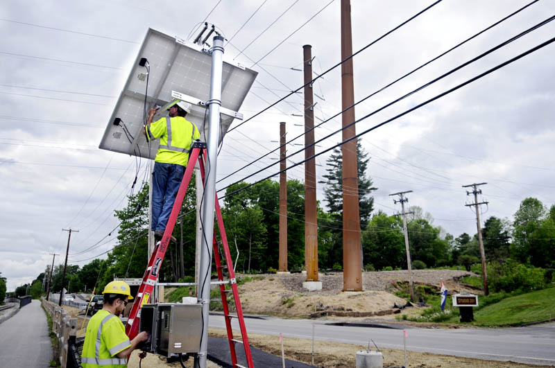 Don’s Electric employees Kirk Gettig, top, and Tom Cameron wire solar panels to a pole Wednesday on Route 201 in Farmingdale. The electricians are erecting two solar banks to power LED poles that will provide a light to bikers and walkers emerging from the trail on Route 201. The work is being paid for by the Maine Department of Transportation.