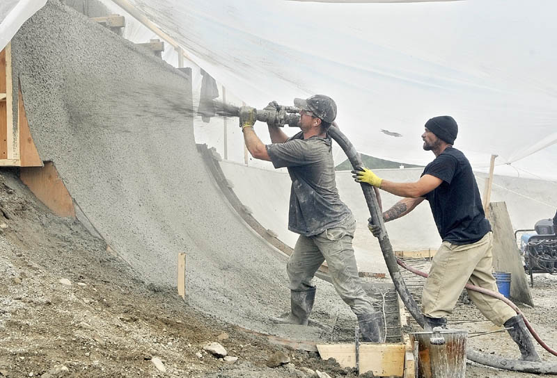 Quentin Sprague, left, and Jackman Wood spray concrete from a hose onto the curved wall in the new addition to the Augusta Skate Park on Wednesday morning in Augusta. The men were part of the crew from Who Skates, the Kennebunkport based company, hired to build the approximately 60-by-70 foot addition to the park. The park is in Williams playground located at corner of Bangor and Quimby streets.