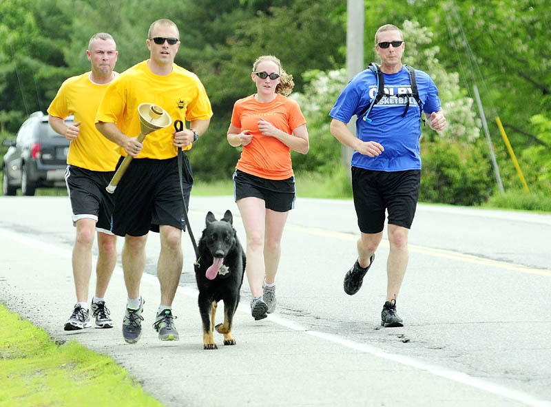 Kennebec County Sheriff’s deputies Scott Mills, left, Cpl. G.J. Neagle III, and Dracco, his police dog, along with Waterville Police Officers Jennifer Weaver and Lincoln Ryder, run a leg of the Special Olympics Torch Run through Vassalboro into Winslow on Thursday. They were joined by several members of the Waterville High School track team in Winslow. Law enforcement officers across the state are taking part in torch runs that will converge in Orono for the state Special Olympics this weekend. Winthrop officers ran a part of a leg from Lewiston to Augusta and Augusta police and fire department members took a leg through the capital city from Hallowell to Vassalboro.