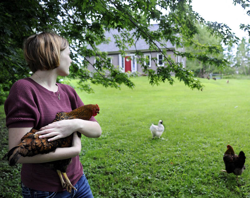 Veronica Jones clutches a chicken Thursday as the remainder of the flock head toward a feeder outside her Readfield home. Jones said the free-range egg layers tend to congregate under her family’s bird feeder to collect loose seeds dropped by songbirds