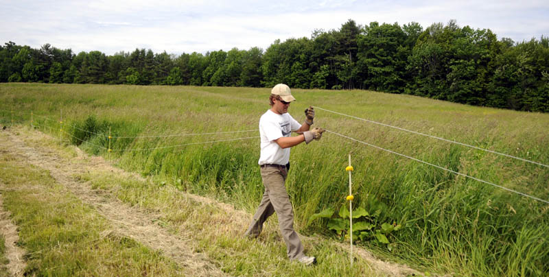 Ethan Noordyk strings an electric fence Monday at Oaklands Farm in Gardiner before moving a herd of grass raised cattle to the new pasture. The field had several moist spots from recent storms but Noordyk and farmer Logan Johnston hung the wires and planned to move the beef critters ahead of rain forecast later this week.