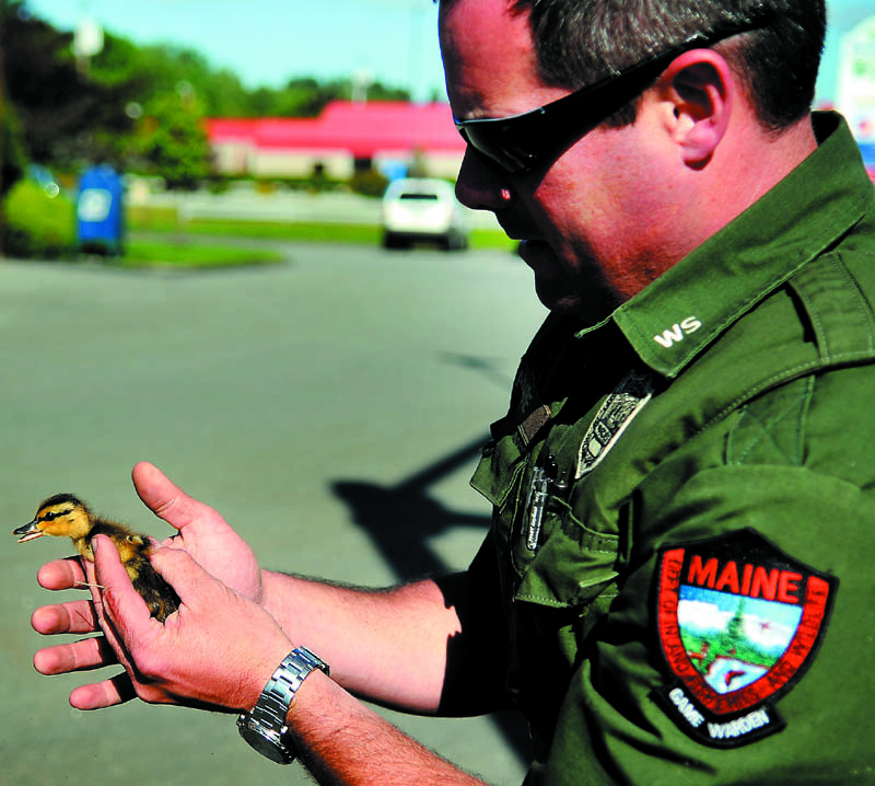 District Game Warden Steve Allaire clutches a Black Duck chick he retrieved Monday on Western Avenue in Augusta. Allaire intercepted a hen and six chicks attempting to cross the busy route at rush hour and retrieved two chicks that become separated from the brood after falling down a storm drain. The mother duck and four chicks walked away and Allaire transported the two babies recovered with a net to a wildlife rehabilitation center. The chicks were probably only a few days old, Allaire said.