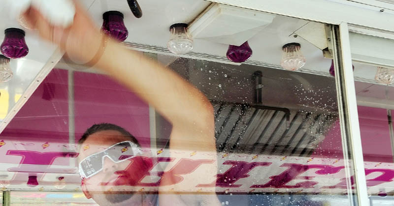 Jonathon Prior cleans the glass of a fried-dough booth Friday afternoon in Gardiner Waterfront Park. There are many events going on today in Gardiner as part of The Greater Gardiner River Festival, which kicks off the Kennebec Valley Chamber of Commerce’s Whatever Family Festival throughout Gardiner, Hallowell, Winthrop and Augusta from now through the Fourth of July. For a list of events, go to www.gardinermainstreet.org.