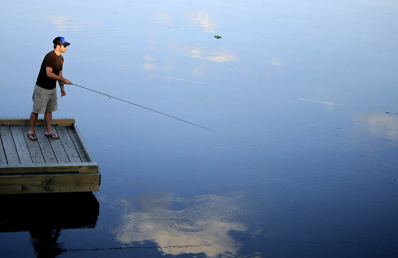 Stephen Dickey, of Hallowell, casts a fly line recently for Striped Bass at the boat landing on the Kennebec River in Hallowell. Dickey said he has spotted plenty of the anadromous game fish that migrates from salt to fresh water to spawn but has yet to catch any.