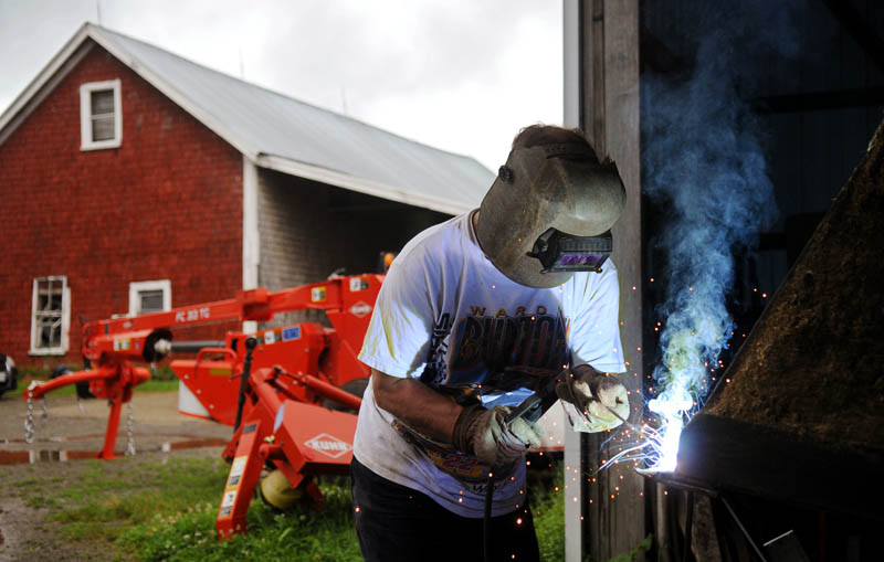 Alton Oliver welds together the cutting edge on the bucket of a tractor at the organic dairy farm he operates in Weeks Mills, China, with his brother, George. The siblings were repairing implements and checking electric fences during a rain break from haying at the Oliver Dairy Farm.