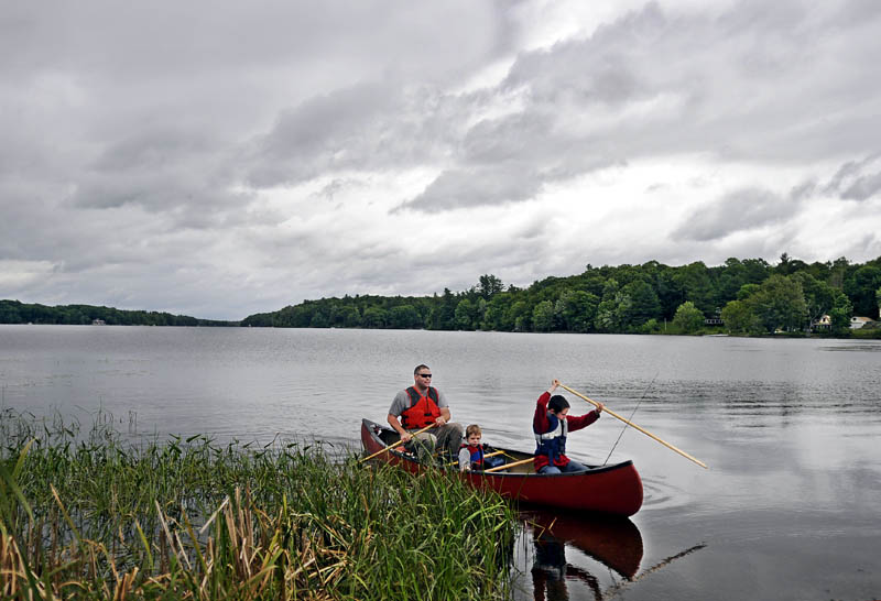 Jake, right, 9, Parker, 5, and Scott MacMaster row back to shore Wednesday after fishing on Pleasant Pond in Litchfield.  Jake caught three yellow perch, Parker caught five yellow perch and their father’s got away when the elder MacMaster dropped his fishing pole on the pond.