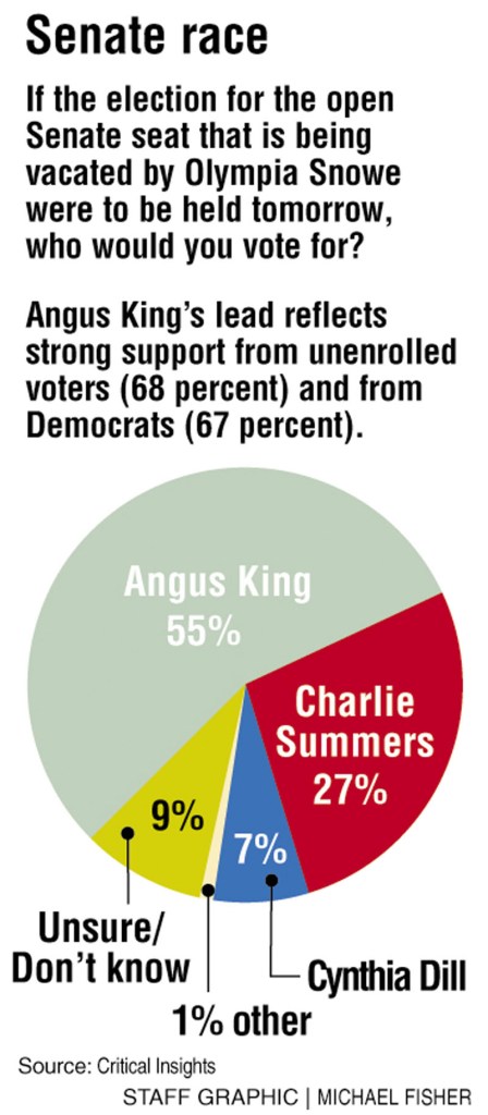 Former Maine Gov. Angus King, meanwhile, holds a substantial lead over his Republican and Democratic rivals in the race for Maine’s open U.S. Senate seat.