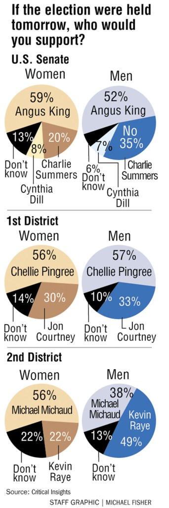 Neither Democratic U.S. Rep. Chellie Pingree, in the 1st Congressional District, nor Democratic U.S. Senate candidate Cynthia Dill has a significantly higher percentage of female supports than male supporters, the poll says.