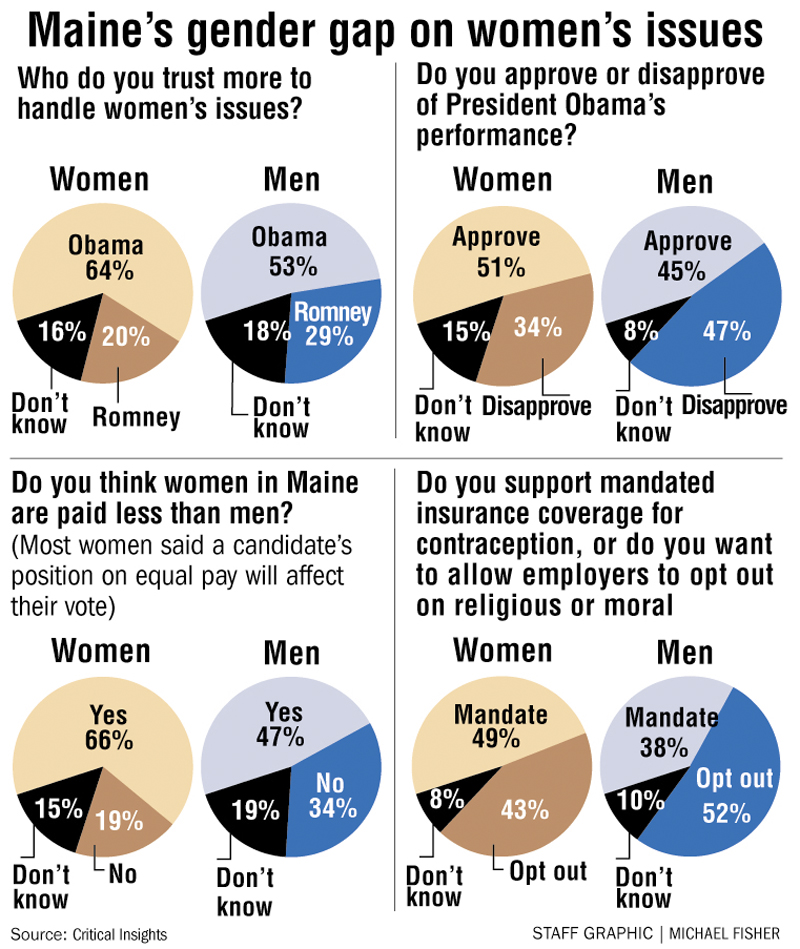 PORTLAND — If Maine’s female voters have their way, Barack Obama will easily win re-election, Maine will overwhelmingly approve same-sex marriage, contraception will be covered by insurance like any other health service, and government will focus more on investing in education than cutting taxes.