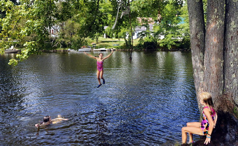 LETTING GO: Alanna Huling, 11, drops into Mill Pond in Wayne on Monday as Hannah Burr, 11, left, swims to shore. Huling’s sister, Hannah, 8, right, waited for her turn on the rope swing while the girls, of Franklin, Mass., took a dip together before having some ice cream during their summer vacation.